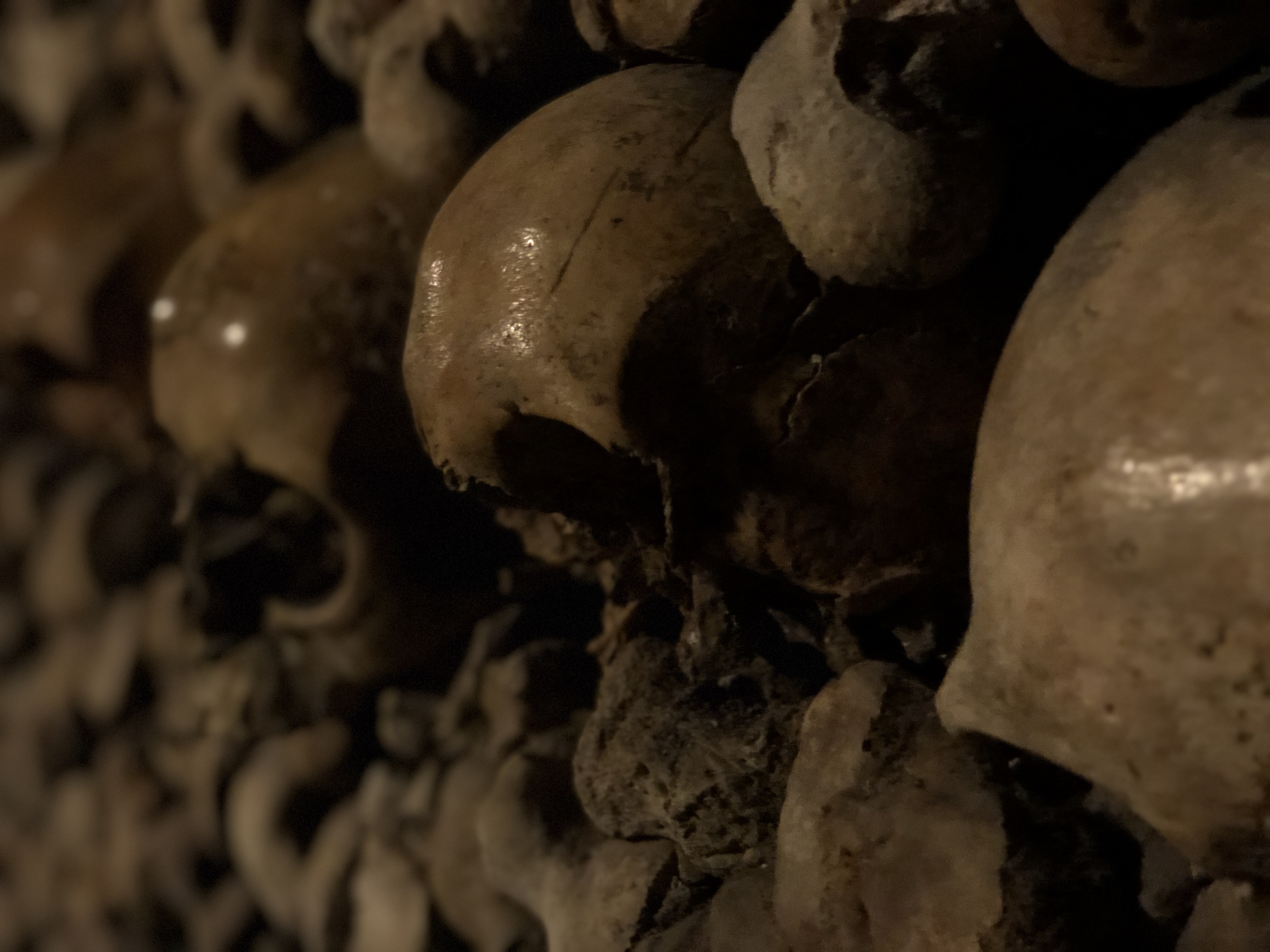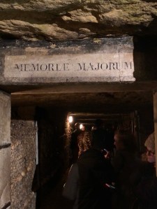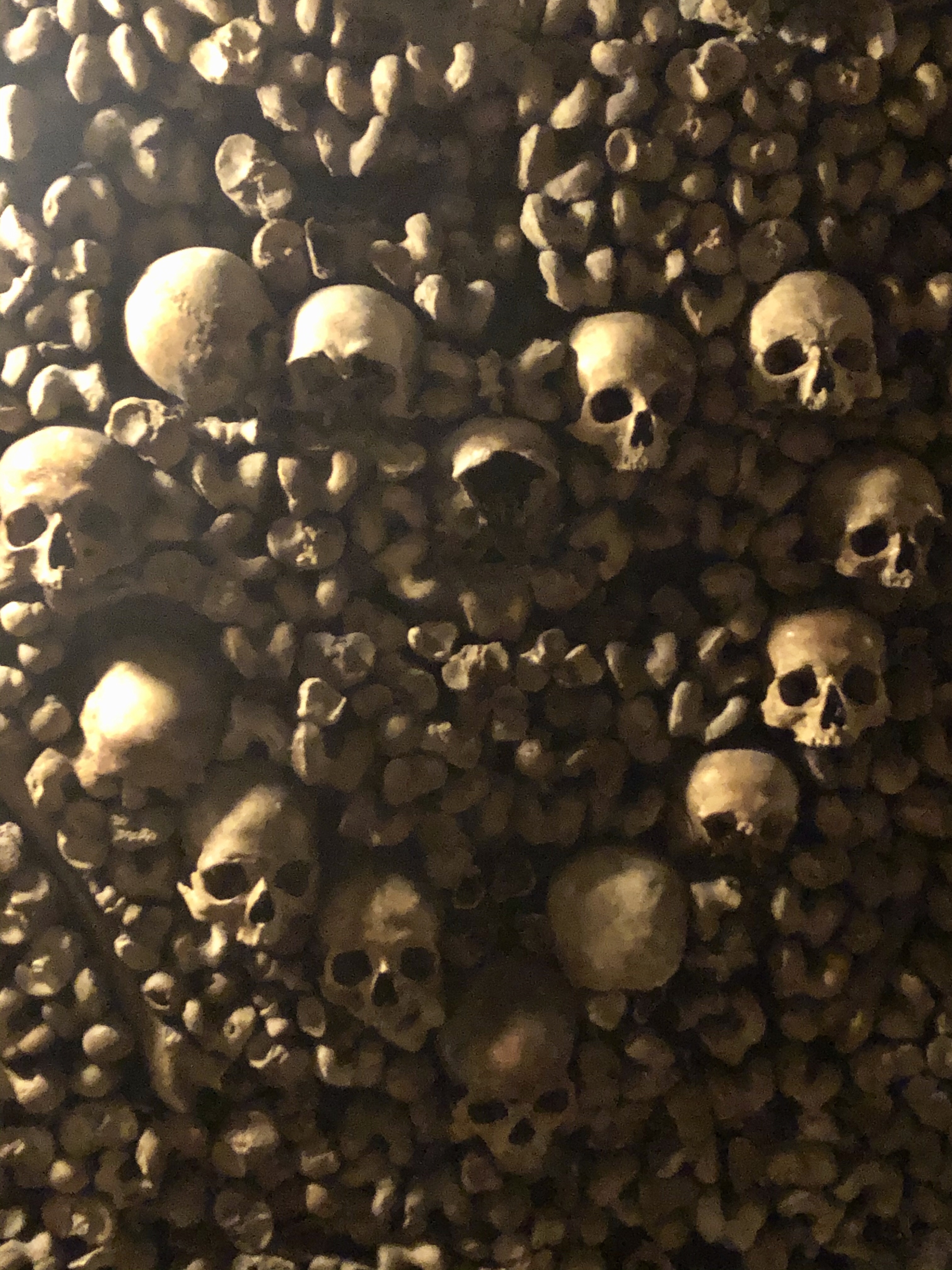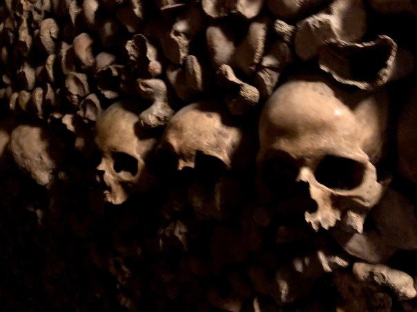 On our return trip from Bordeaux, we spent the night again in Montparnasse, so we could go beneath Paris to see where millions of its former residents are interred (many of whom met their end via guillotine or revolution). Long story short: in the late 1700s the centuries old, crowded cemeteries caused some issues — including vapors so bad they curdled milk and soured wine (um there’s no effing way Parisians are going to deal with rotten wine) — so in the dead of night graves were dug up and remains were dumped into an abandoned quarry in what was, at the time, outside the city. One of the guys in charge thought it would be cool to organize the bones in patterns and surround them with pithy quotes that would celebrate life and lol not make their chamber of death so gloomy.