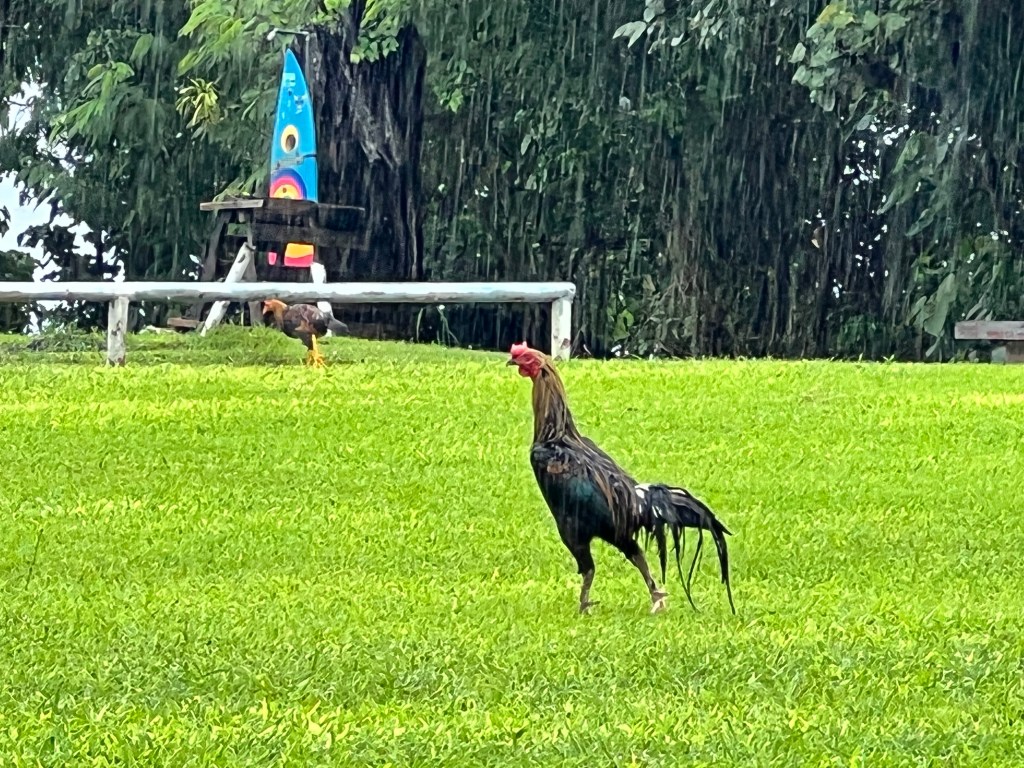 I don’t know what this says about me, but these feral fowl fascinate me: so much so that I invested way too many minutes googling Guam chickens. Apparently, they’ve become a nuisance and have managed to hatch some headlines. One of my favorite quotes comes from a 2021 article in The Guam Daily Post, which focused on the demand for authorities to contain chicken shenanigans.