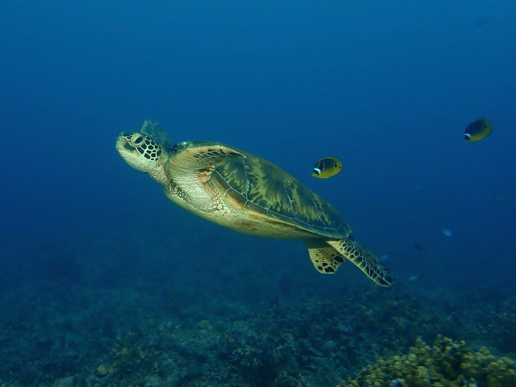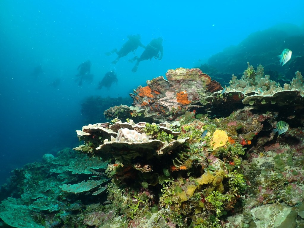 Imagine hovering along a mound of coral and rocks. It’s murky — there is a wall of green-blue water behind the variety of fish you see going about their business. Some check you out, most have more important things to do. It’s just you, your small group of dive friends (on the boat better known as Team A), your dive guide and the marine life that thrives there. You’ve given up hope on seeing a manta (this dive), so you inhale, exhale, hover, check out the little things who are just as beautiful. All of a sudden you sense something behind you. A large manta ray glides in from the distance, swoops down within inches of you, so that it can look you in the eye — deciding whether or not he (or she) wants to spend more time with you. The manta is so close, in fact, you turn onto your back, so that you’re both belly to belly, swaying in each other’s wake.